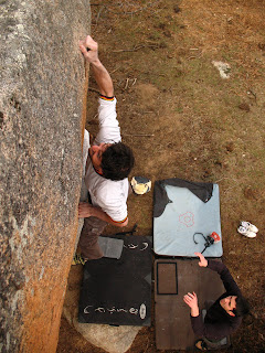 Y despues cambiamos de sector, ellos fueron a probar "l'aquarium envolé" y yo segui con mi "tombeau..." que esta a punto de caramelo, ahora siempre pillo la regleta, meto talon derecho y voy al plano de salida la cosa es que toco un poco con los pies en el crash pad y eso no me mola, asi que voy a probar con aditions pads, si esos mas pequeñitos, que por lo menos no me molesten, y con gente que pare, que por poco me la pego de verdad y de unos rasguños a un brazo roto o algo peor medio metro me falto... gajes del oficio y de la peña trankila... en fin que otro dia sera!!
