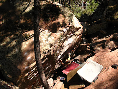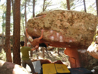 Dormimos como reyes y martes a blokar como locos, demasiado locos porque con las ganas en una de las caidas Seb casi se hace un tobillo y yo me revente la espalda callendo contra una roca que se interpuso en mi camino hacia el suelo...en fin, que solo Phil parecia guardar la calma en vistas de su proyecto: “cosmos” un 8a+ que como su grado y nombre indica esconde un cosmos de dificultad en sus dos movimientos realmente duros en techo como a el le gusta, que Phil terminara por realizar, sino esta semana, sera la que viene..quizas en estos momentos lo que era un proyecto deja lugar a la calma que sigue al encadenamiento...pronto tendremos noticias suyas porque el podia quedarse un par de dias mas pero nosotros teniamos que volver a trabajar... hay quien dice que el trabajo es salud... yo digo que cuando mas sano estoy es cuando intento llevar a cabo mis sueños mas desplomados y salvajes... en fin, que tres dias disfrutando en este paraiso dan para mucho y para poco al mismo tiempo porque bloques hay un monton: faciles, duros y mas duros todavia, todos ellos esperando individuos que contrariando las leyes de la gravedad terminen por ejecutar la a veces macabra danza que los lleve a su cima...